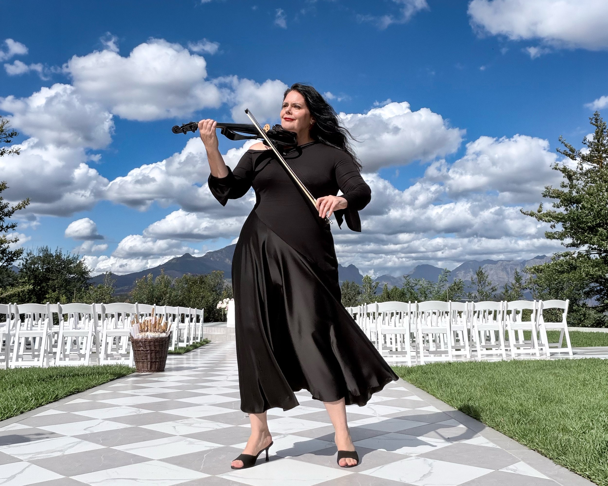 Larah Eksteen wearing a black dress, is posing with her hand on her chest and holding a black violin with her other hand, outdoors with a blue sky, white clouds, and mountains in the background.
